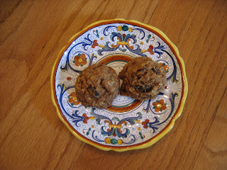 I make these so often that I now play even faster and looser than usual with the recipe (the Crunchy Oatmeal Cookie in King Arthur). Sometimes I get lucky, and this (improbably, as you'll see) was one such time. I cut the recommended 3/4 C white sugar and 3/4 C brown to a single cup of brown. I substituted whole wheat flour (locally raised and ground by a guy with whom my husband went to college) for regular, added raisins and walnuts, and made the cookies twice as big as I usually do (too lazy to scoop little ones). Let me tell you, the results, nasty and health-food-ish as they may sound, are sublime: a truly great, flavorful, chewy, rich oatmeal cookie.